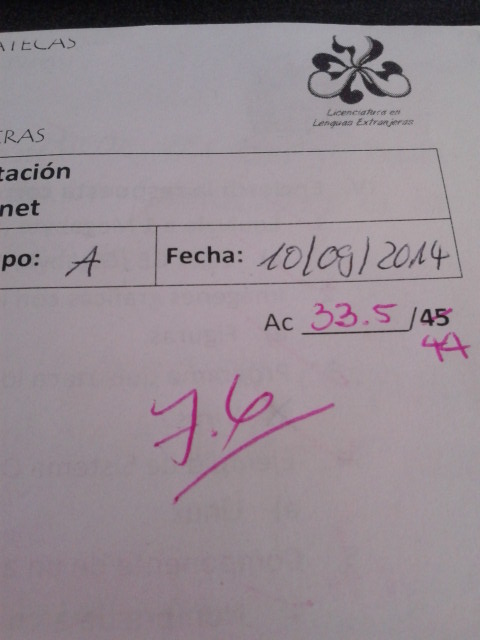 Ich veröffentliche das, weil es meine erste richtige Uni-Note auf mexikanischem Boden ist. Keine Angst, ich werde jetzt nicht jedes Ergebnisse hier reinschreiben, aber die erste Note darf doch noch erwähnt werden. Und ich bin auch ein bisschen stolz und glücklich, weil ich ja noch so rumgejammert habe. Ich habe 76 Prozent, was einer 7,6 entspricht, was wiederum auf 8 Punkte aufgerundet wird – von zehn möglichen Notenpunkten. Na, das ist doch gar nicht mal so schlecht, oder? Als erste Klausur in Informatik und das auf Spanisch. Ich finde es prima.