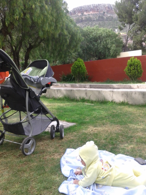 Das ist wohl am letzten sonnigen Tag im Juni aufgenommen. Obwohl man Sonne nur bei genauem Hinsehen sieht. Da habe ich mal den Mut zusammen genommen und bin mit der Karre los. Da erste und das letzte Mal. Aus dem Haus raus geht ja noch. Dann am Tor der erste Balanceakt. Die Karre so hinstellen, dass sie einem nicht davon fährt (Berg) oder umkippt und dass sie trotzdem noch so sicher steht, dass ein vorbeisausendes Auto sie nicht erfässt, während ich das Schloss wieder vor das Tor mache. Dann geht es los. 300 Meter hat man einen „einigermaßen“ Asphalt, wo das Baby nur durch ein Tope, eine Bodenwelle zur Geschwindigkeitsbegrenzung, durchgeschüttelt wird. Dann geht es bergab. Meine Arme!!! Physik macht es möglich, dass die Karre mit den neun Kilogramm Inhalt eine große Sogkraft entwickelt und gefährlich hin- und herwackelt, auch weil hier der Asphalt schlechter wird. Ich muss mich also gut konzentrieren und die Karre ordentlich festhalten. Unten angekommen wird es holprig. Der Asphalt ist hier weitgehend Schotter gewichen und das Kind wird durchgeschüttelt, als gebe es kein Morgen. Dann wechselt das Pflaster zum traditionellen. Heißt große Stücke Steine in Beton gegossen, wobei letzterer aber kaum noch vorhanden ist. Ergo: Shake it, Baby! Und dann nur noch einen sehr hohen Bürgersteig hoch — wobei ich zugeben muss, dass ich den Handicap-Zugang übersehen habe — und endlich bin ich im Park. Hier sind die Wege aber auch grauselig, weshalb ich mich nach einer Runde auf den Rasen setze.