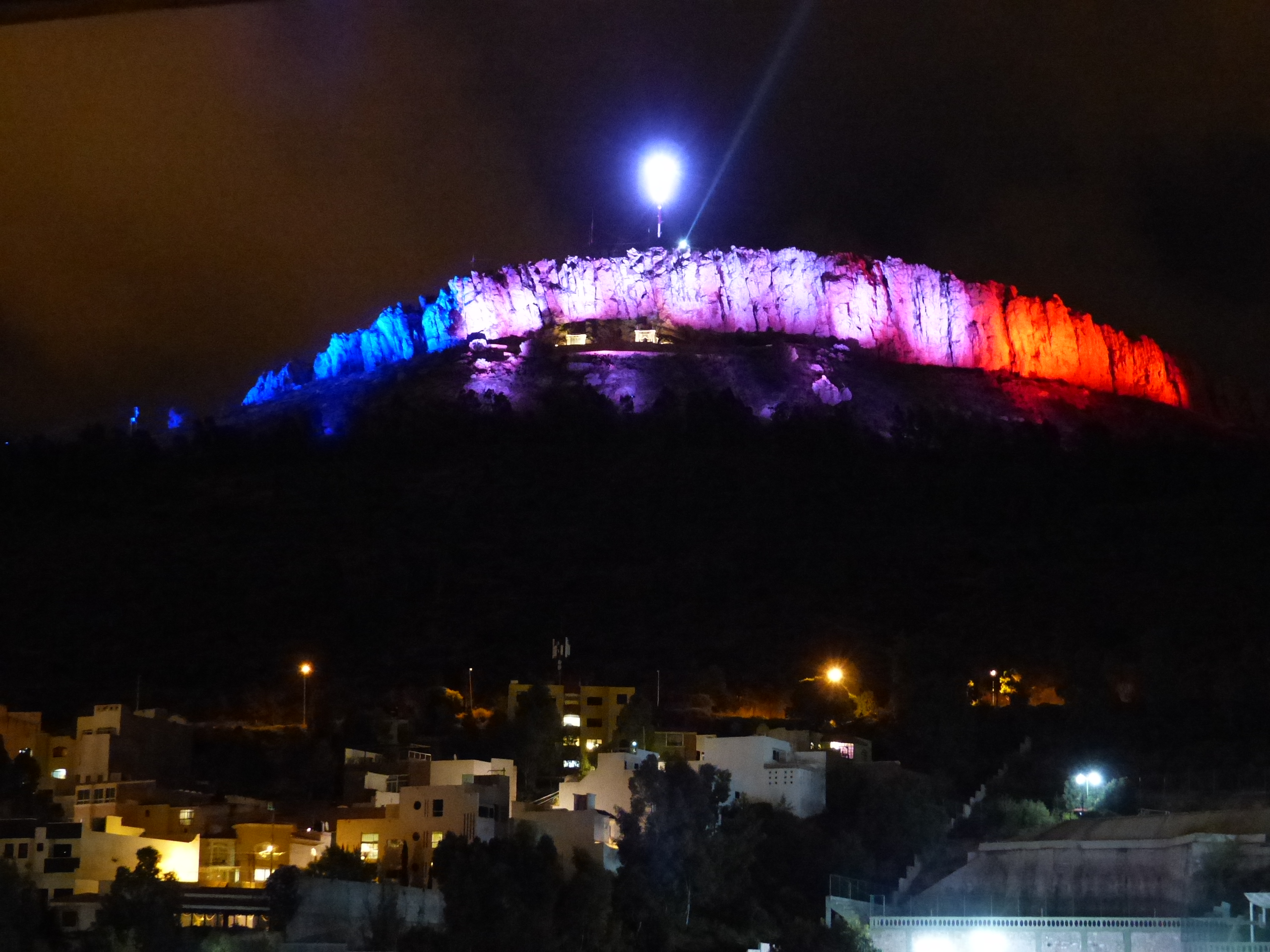 Gestern habe ich dann auch gemerkt, dass es wirklich angekommen ist, selbst bei der Regierung oder wer auch immer für die Beleuchtung zuständig ist. Statt der mexikanischen Farben erleuchtete La Bufa – der Berg über Zacatecas in der französischen Flagge.