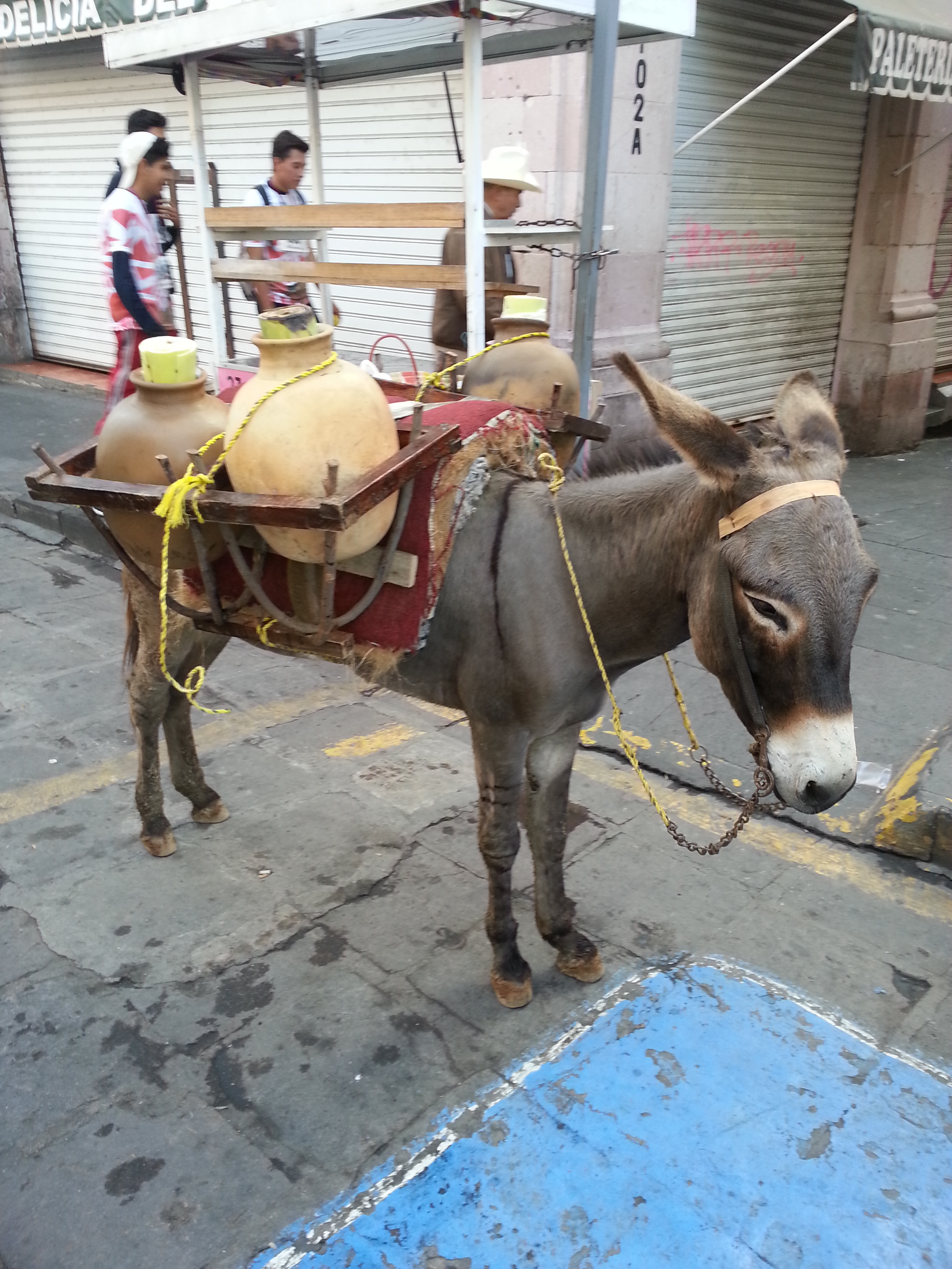 Morgens im Zentrum von Zacatecas kann man einen Esel (mit Besitzer) sehen, der vier große Krüge trägt. Es sind, glaube ich, mittlerweile mehr als nur ein Esel, es ist wohl zum Familiengeschäft geworden. Aber darum geht es ja nicht. Der Esel trägt auf seinem Rücken „agua de miel“ – Honigwasser in exakter Übersetzung. Es ist das Wasser der Agave. Einer Agave, ich weiß nicht genau welcher. Die wird angezapft und dann kommt dieses Honigwasser heraus. Schmeckt süß und ähnelt auf der Zunge Kokosnussmilch, ohne den Kokosgeschmack. Ich finde, manchmal hat es einen leicht alkoholischen Nachgeschmack.