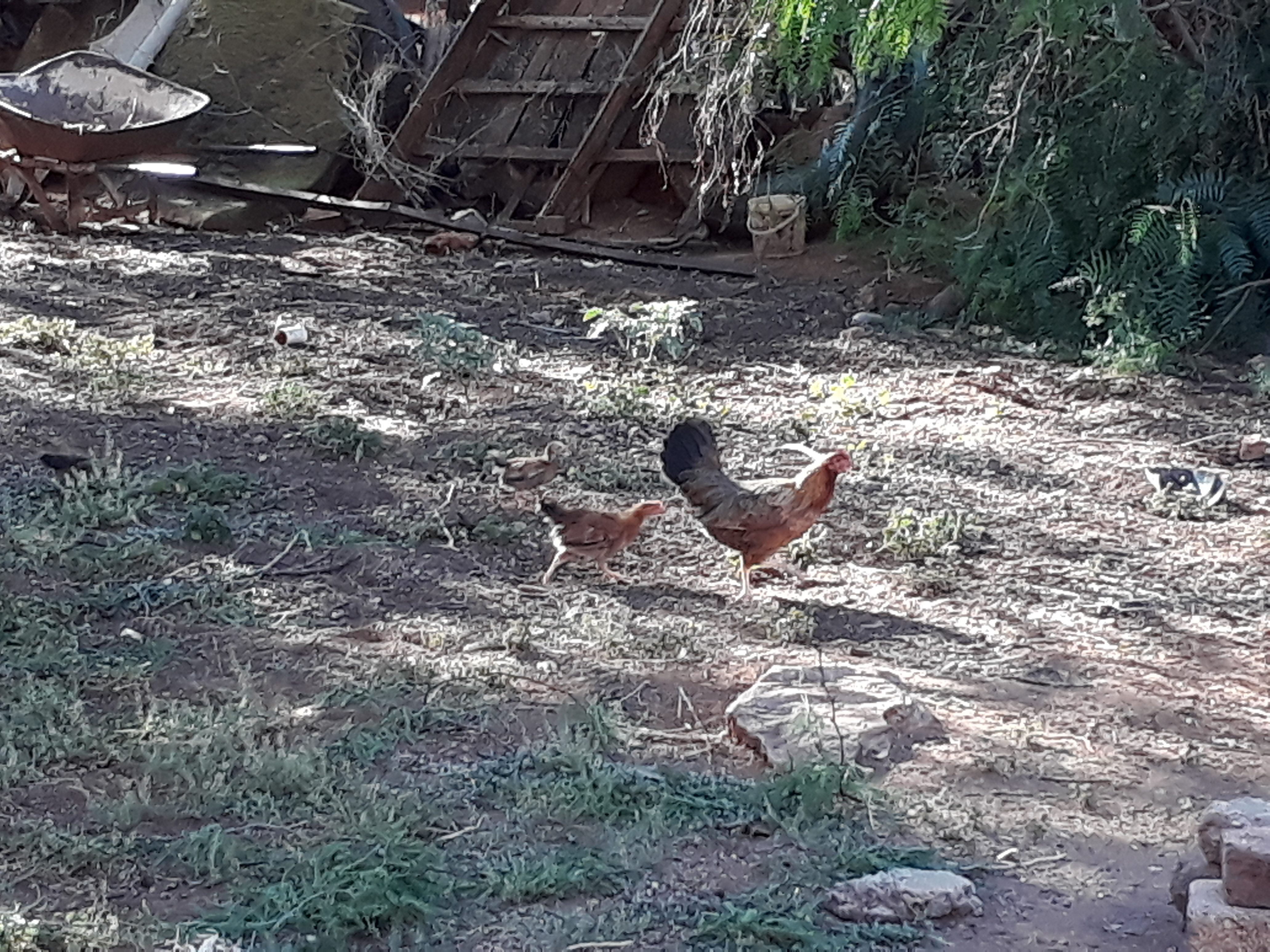 Dort können wir entspannen und die Zeit geht sehr viel langsamer. Es gibt kaum Handy-Empfang. Natürlich gibt es einen Fernseher, aber wir sind ja nicht zum Fernsehen da. Meine Schwiegereltern haben ein riesengroßes Grundstück, auf welchem zwei Häuser stehen. Außerdem gibt es Bäume und einen Unterstand für Traktor und Arbeitsmaschinen. Dazwischen laufen Hähne und Hühner und auch drei Küken, die schon etwas größer sind. Und seit zwei Wochen gibt es eine Katze, die sich aber noch versteckt.