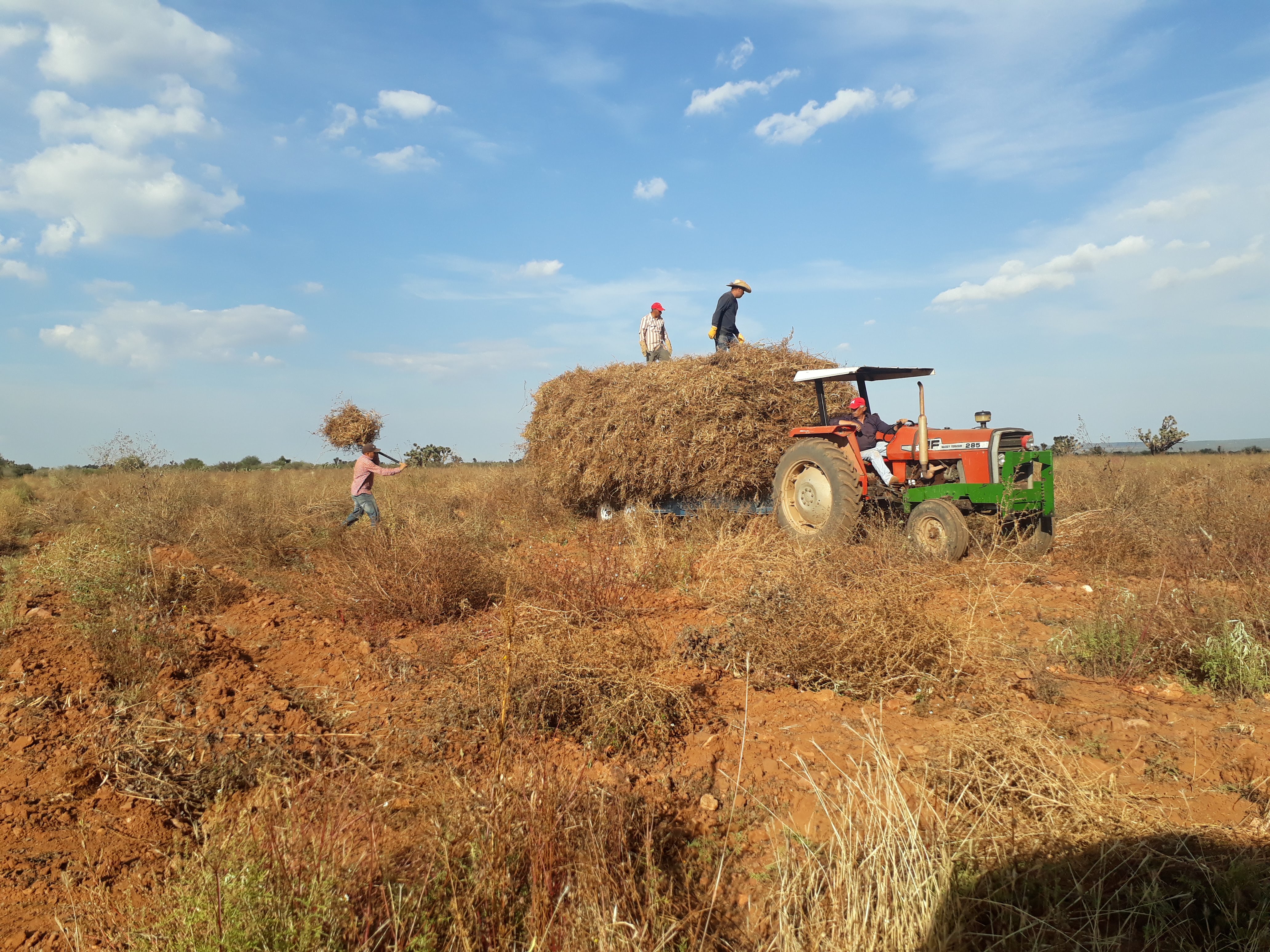 Das Einholen der Ernte kann stets verschieden aussehen. Hier ist es die Technik, mit der Hand die Bohnenpflanzen aus der Erde zu sehen und sie dann mit der Hand auf den Anhänger zu verfrachten, um sie dann gesondert durch eine Maschine zu jagen, die die Pflanze von der Bohne trennt und dann mit der Hand in die Säcke zu füllen.