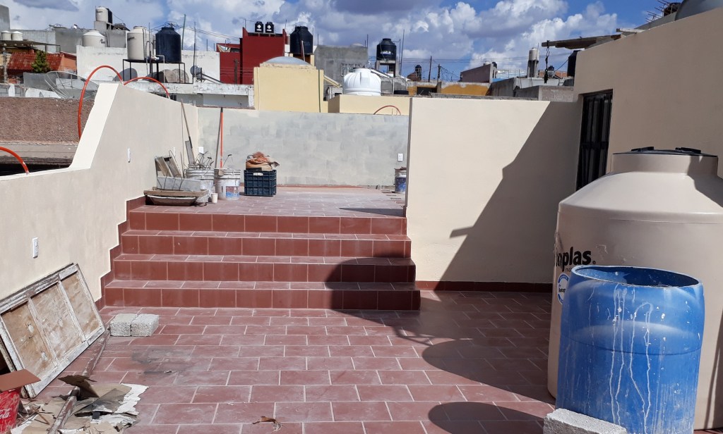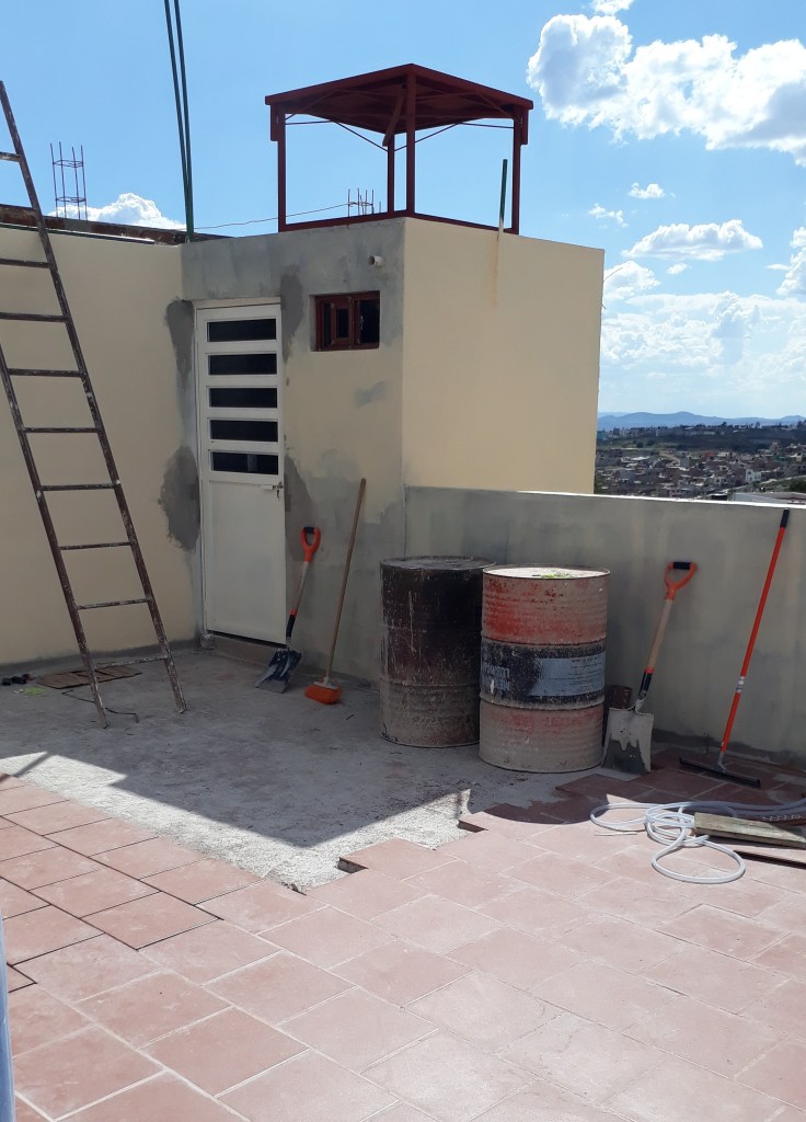 Wir sind ganz zufrieden mit der Arbeit. Ich so halbwegs. Aber die Veränderung ist enorm. Die Tropfstellen am Dach sind verschwunden und es macht wahre Freude aus den Schlafzimmer-Fenstern zu gucken. Die Waschmaschine hat endlich nach mexikanischer Manier ihren Weg nach oben aufs Dach gefunden und ich muss mich nun daran gewöhnen, auch die Sonne als Trockner zu benutzen. Bisher habe ich in einem Hof oder eben im Haus die Wäsche getrocknet. Dass ich die Wäsche nun draußen aufhängen kann, gibt einem ganz neue Möglichkeiten. Sonne bleicht. Auf 2400 m Höhe hat sie eine enorme Kraft. Das ist für weiße Wäsche toll. Für schwarze Wäsche nicht so toll. Also, eine weitere Herausforderung und Experimente, was besser für mich und die Wäsche funktioniert.