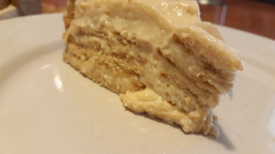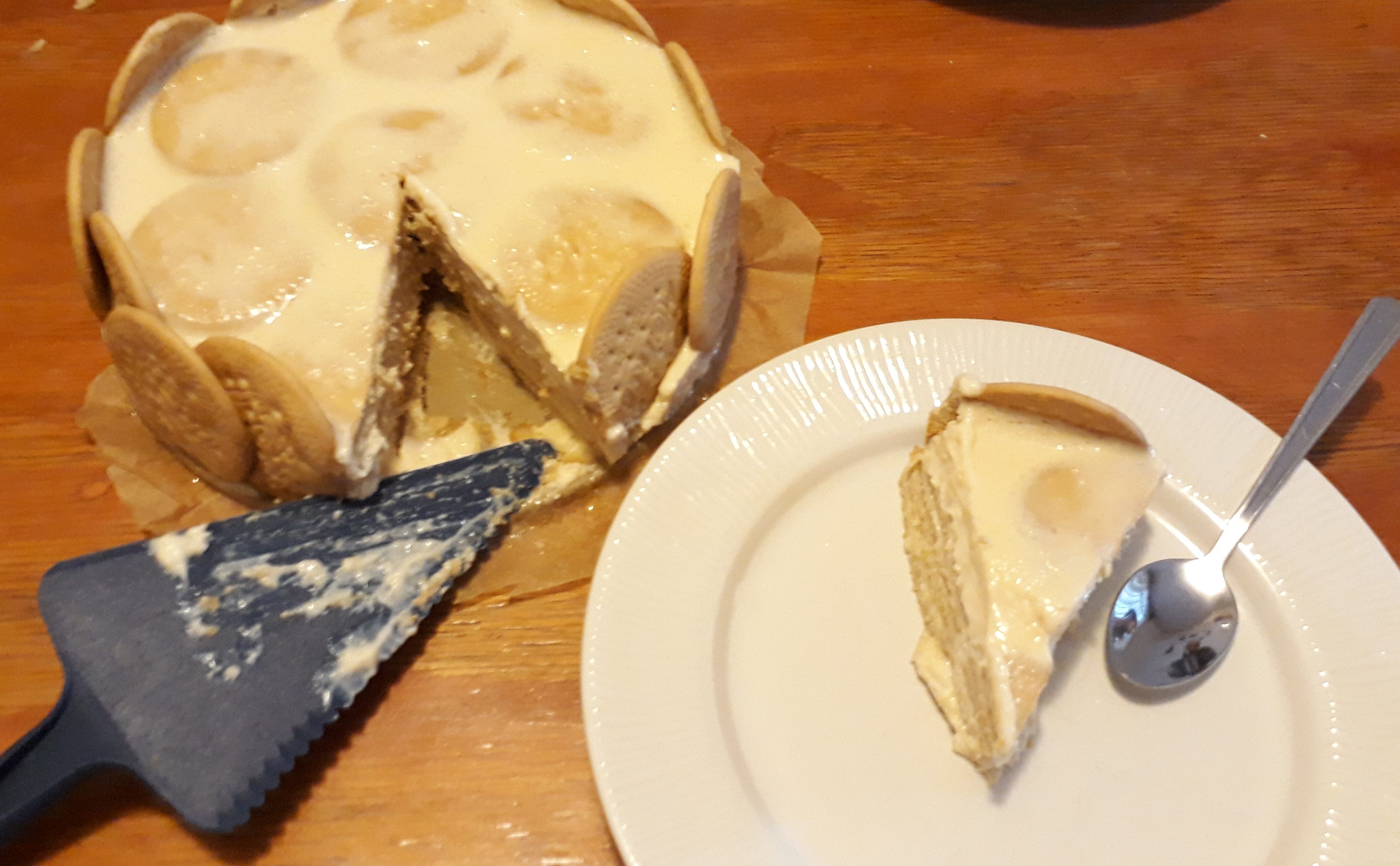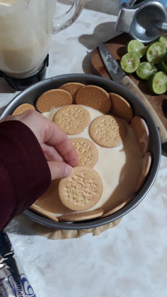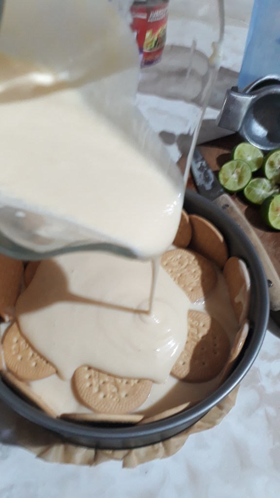 Nun eine Schicht Kekse in die Form legen. Auch die Ränder, wer mag. Dann eine Schicht mit der Limetten-Creme, dann wieder Kekse, dann wieder die Creme und wieder Kekse,… bis die Creme aufgebraucht ist. Mit einer Creme-Schicht abschließen. Die Kekse sollten richtig weich werden dürfen.